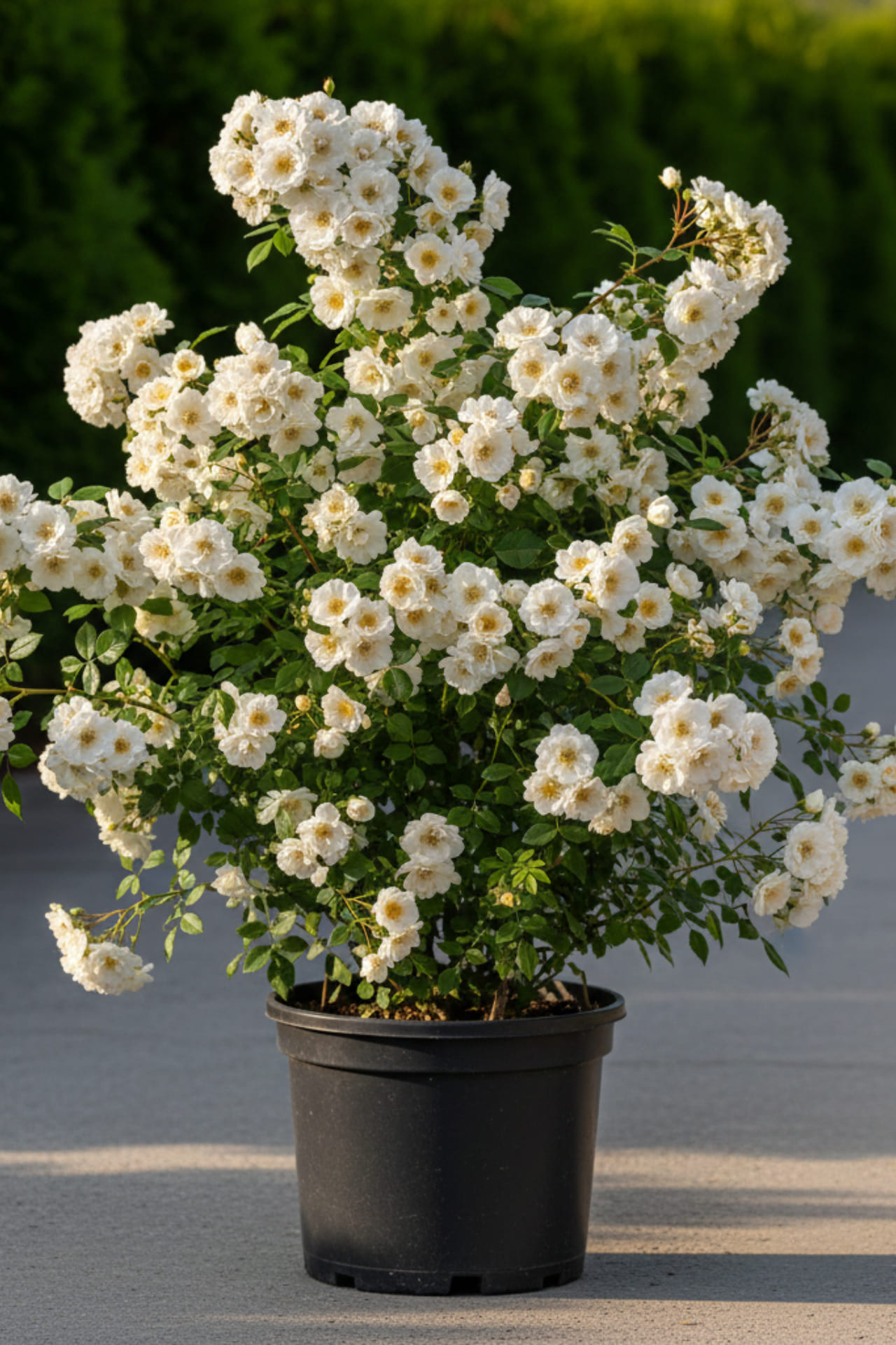 - Аккуратные белые, полумахровые цветки 4,5 см в диаметре появляются в крупных густых щитковидных соцветиях по 5-15 штук из заостренных, зеленоватых с оттенком розового бутонов. В центре цветка расположен пучок золотых тычинок, цветки сильно пахнут мускусом.